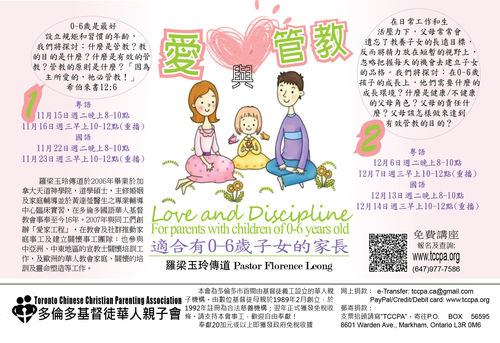 我們作為父母, 在日常工作和生活壓力下﹐常常會遺忘了教養子女的長遠目標﹐反而將精力放在短暫的視野上﹐忽略把握每天的機會﹐去建立子女的品格。透過這次講座, 我們將探討: 在0-6歲孩子的成長上, 他們需要什麼樣的成長環境? 什麼是健康/不健康的父母角色? 父母的責任是什麼?父母該如何做來達到有效管教的目的?